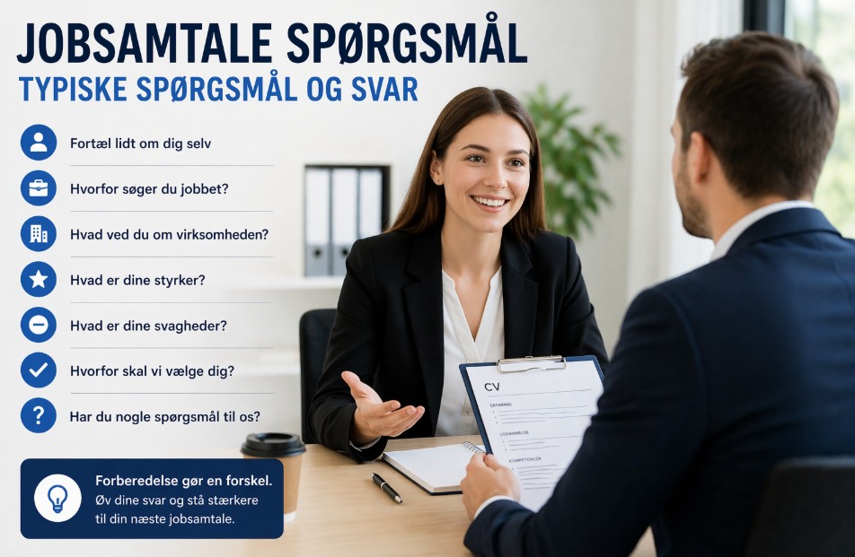 I denne guide får du en komplet oversigt over jobsamtale spørgsmål og svar, som ofte bruges i Danmark. Du får også konkrete eksempler på, hvordan du kan svare professionelt og øge dine chancer for at få jobbet.