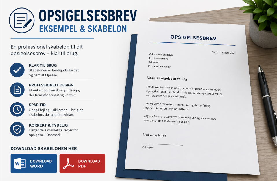 Hvis du ønsker en hurtig og professionel løsning, kan du bruge en færdig opsigelsesbrev skabelon. Den er nem at redigere og følger de almindelige regler for opsigelse i Danmark.